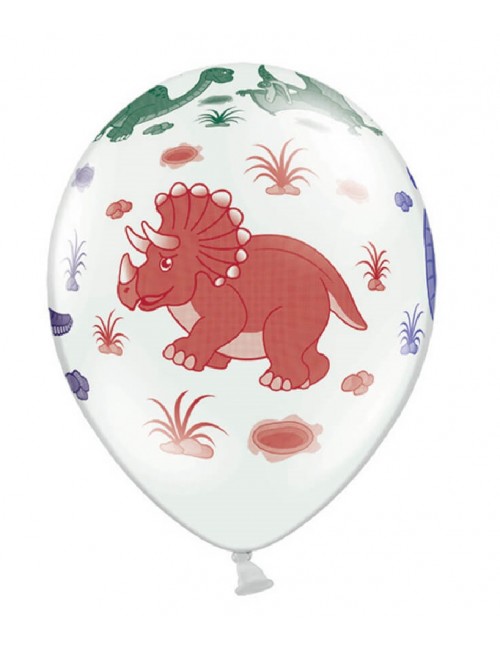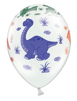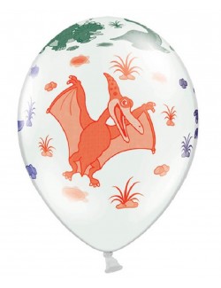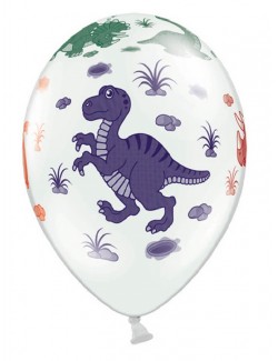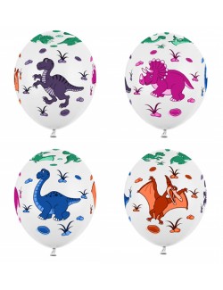 Set 5 baloane latex, Dinozauri 30 cm, culoare alba cu imprimeu multicolor, potrivite pentru umplerea cu heliu sau cu aer.