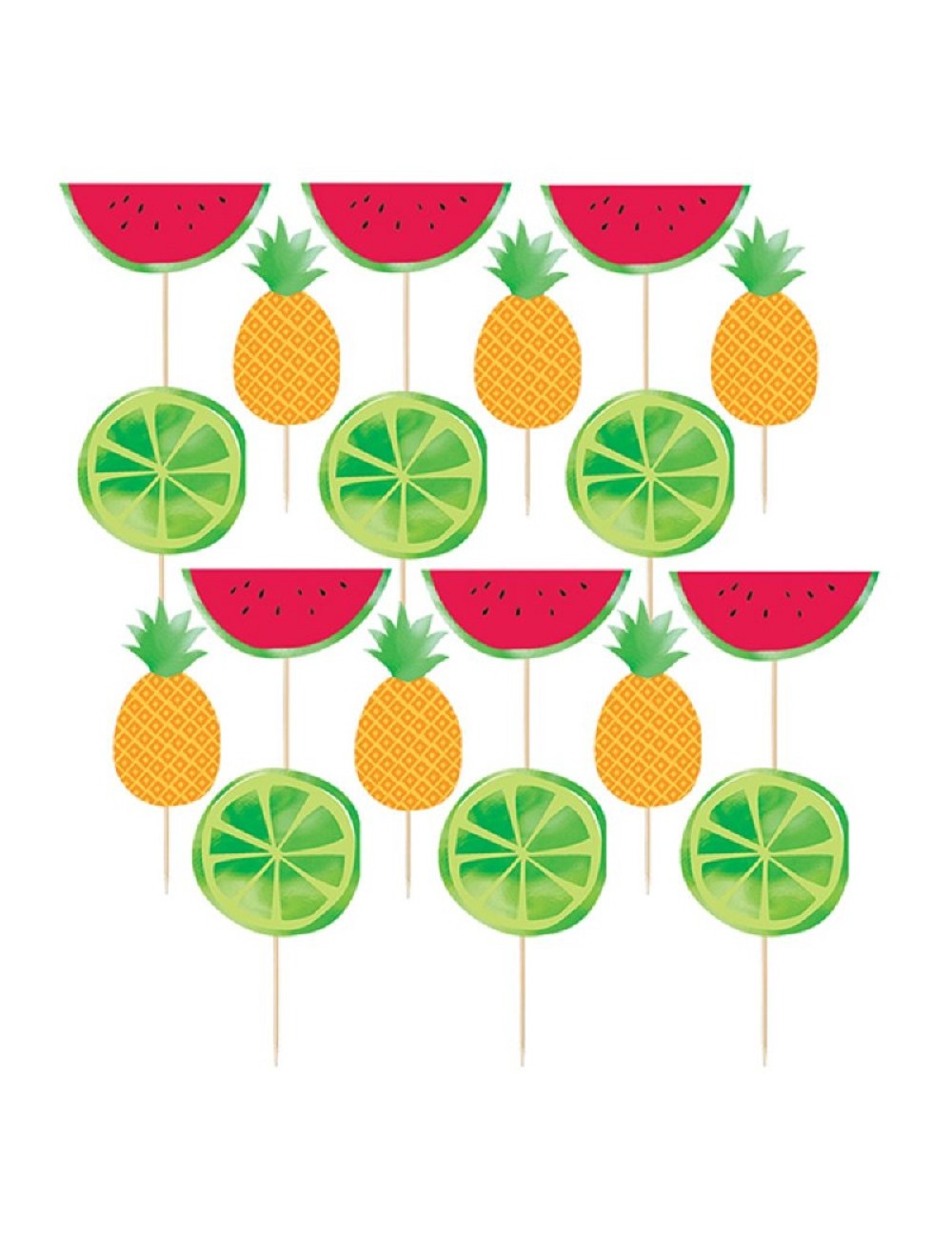 Set 24 Scobitori decorative, Fructe Tropicale, 9 cm, din lemn si decoratiuni din hartie colorata, decupate cu forma unor fructe exotice.