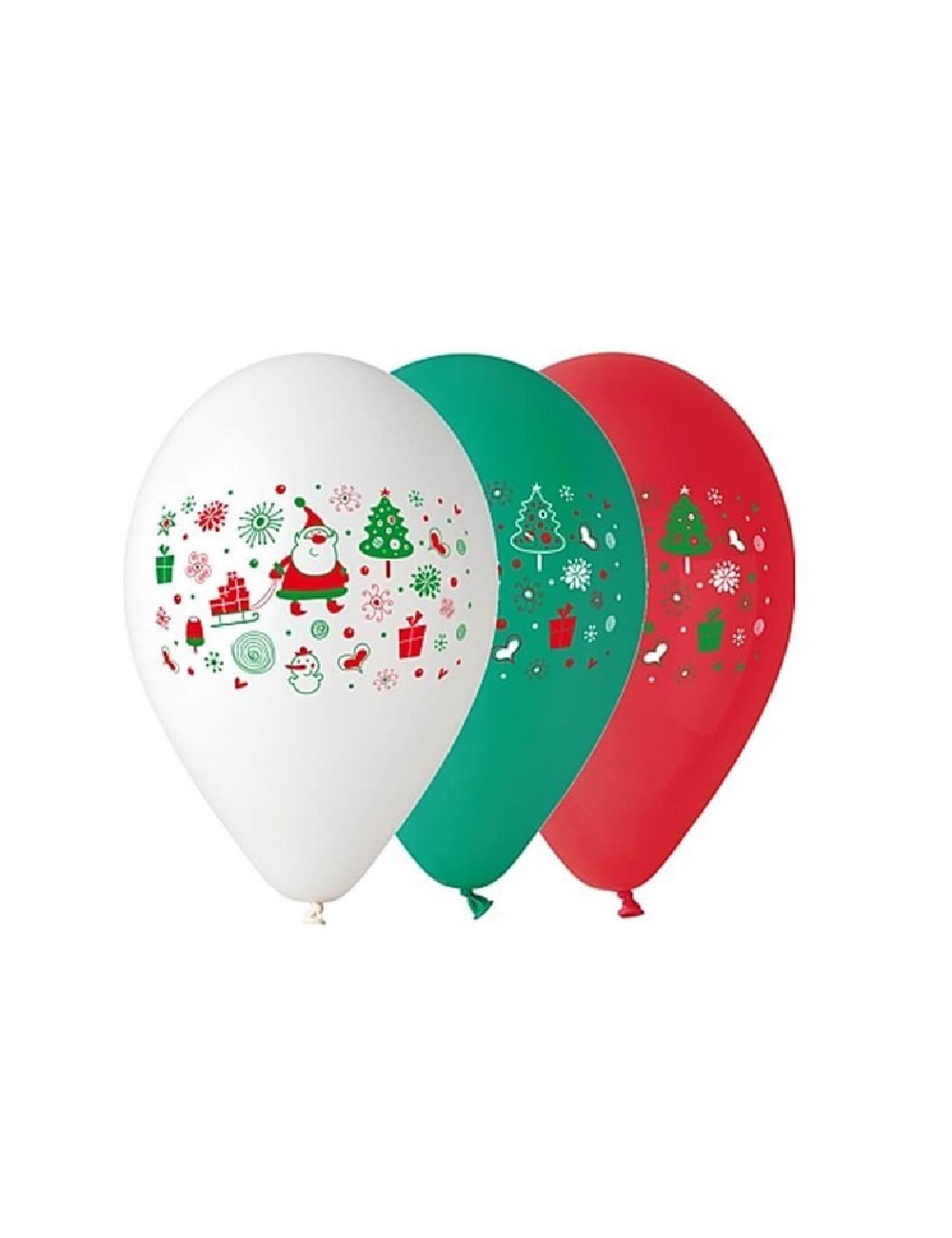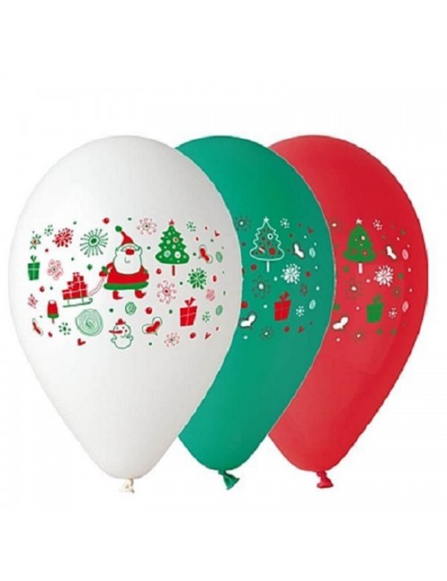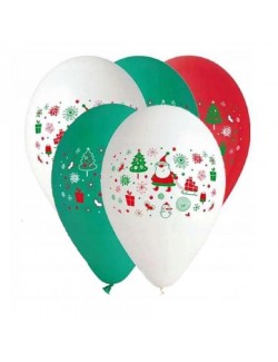 Set 5 baloane de Craciun, multicolore, 30 cm, din latex-cauciuc natural, culori rosu, alb si verde.
