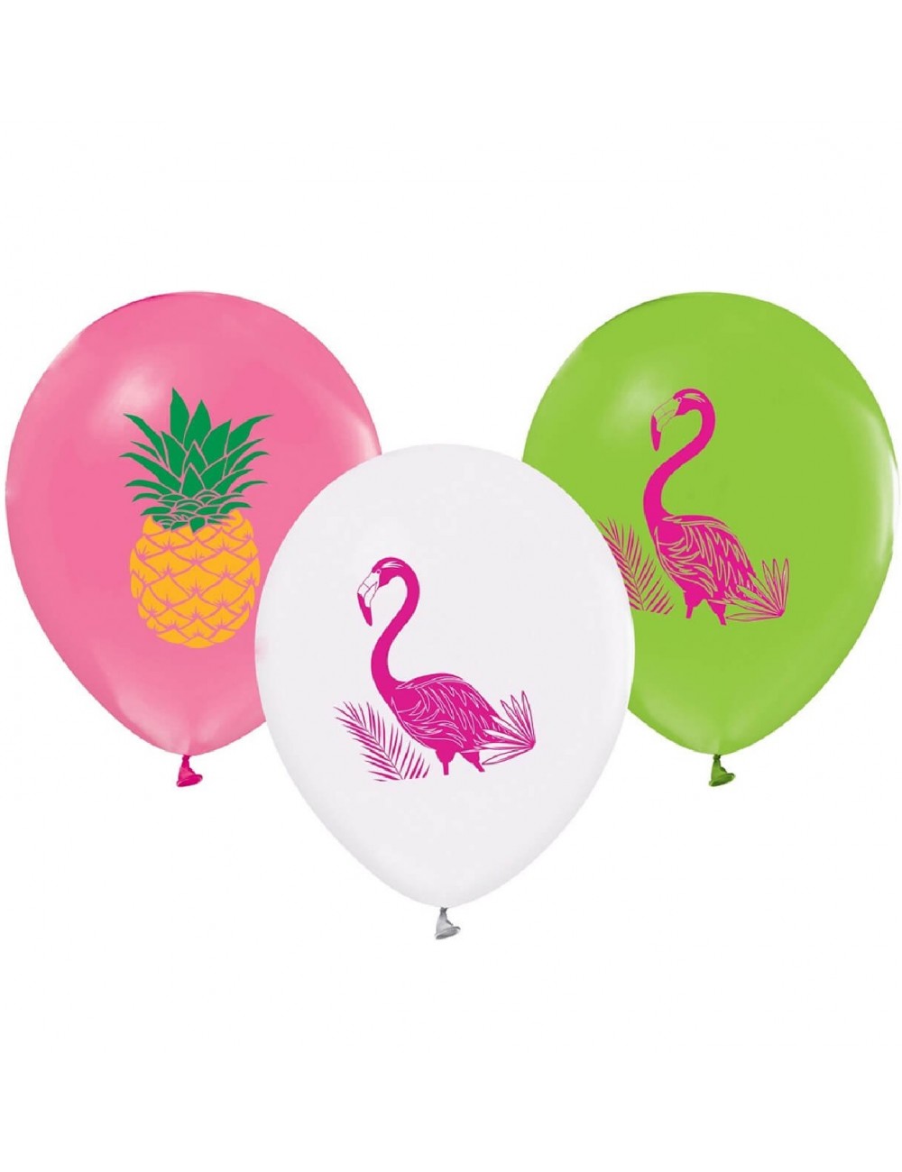 Set 5 baloane Flamingo & Ananas, 30 cm, multicolore, din latex-cauciuc natural, culori roz, alb, verde.