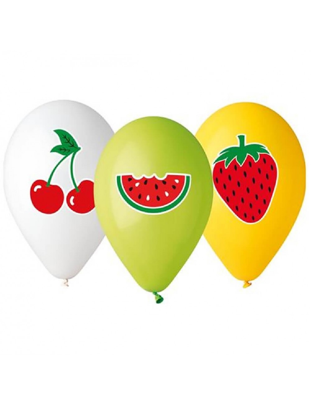 Set 5 baloane Fructe, 33 cm, multicolore, din latex-cauciuc natural, culori galben, alb, verde, imprimate cu cirese, pepene si capsuna.