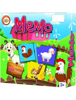 Joc de memorie Ferma vesela care contine 36 cartonase imprimate, pentru 2 până la 8 jucători.