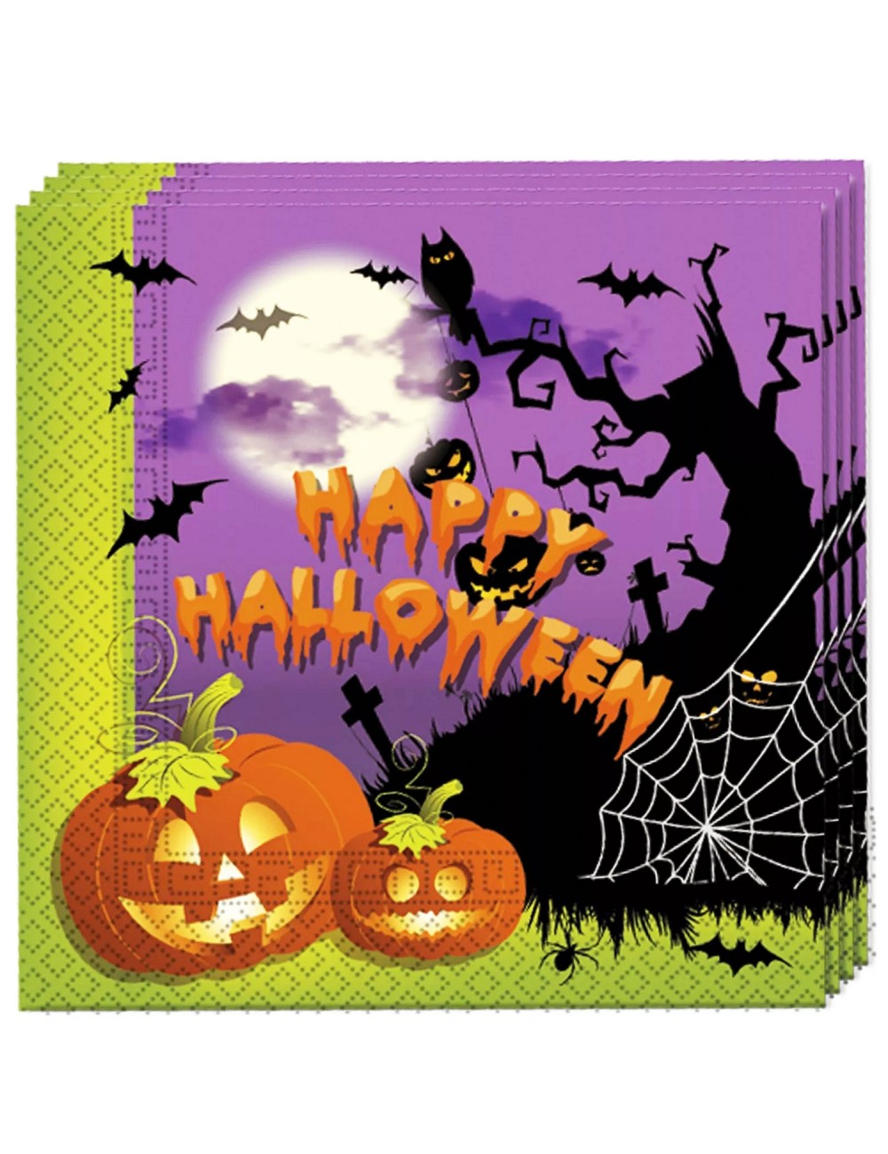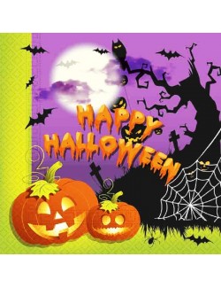 Set 20 servetele Spooky Halloween, dimensiuni 33*33 cm (extins), din 2 straturi de hartie, imprimeu multicolor cu elemente specifice Halloween-ului.