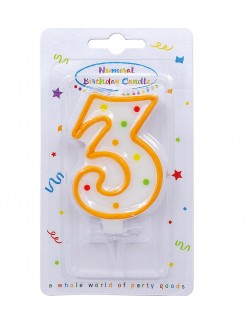 Lumanare pentru tort, Cifra 3, din parafina alba cu confetti colorate si chenar galben, perfecta pentru petreceri aniversare.