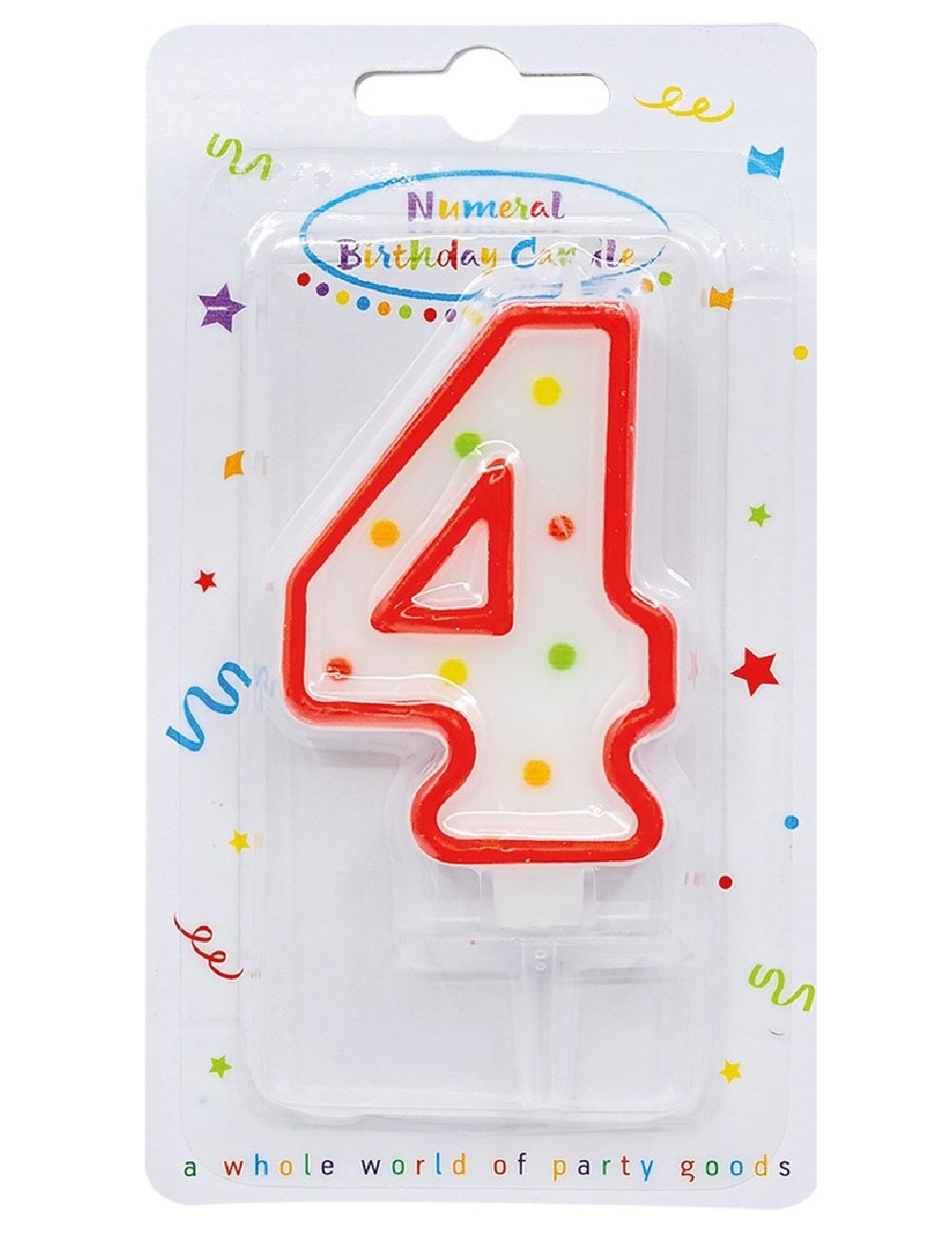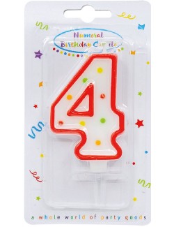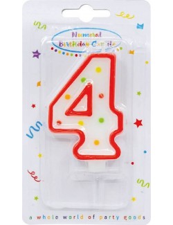 Lumanare pentru tort, Cifra 4, din parafina alba cu confetti colorate si chenar rosu, perfecta pentru petreceri aniversare.