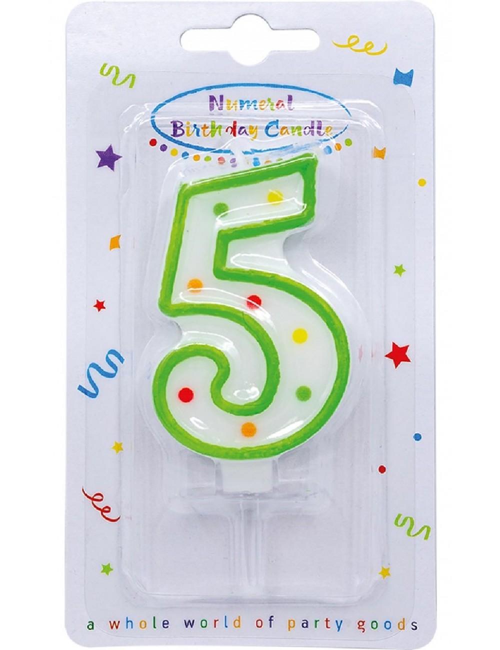 Lumanare pentru tort, Cifra 5, din parafina alba cu confetti colorate si chenar verde, perfecta pentru petreceri aniversare.