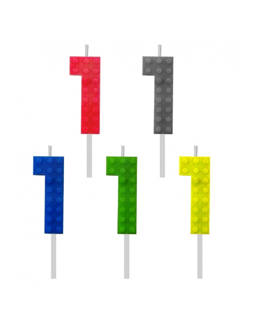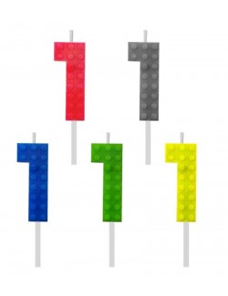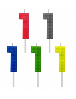Lumanare tort, Cifra 1 Bricks, inaltime 5,5 cm, din parafina, culori diferite: verde, galben, gri, albastru, rosu, este fixata pe un suport din plastic, perfecta pentru petreceri aniversare.