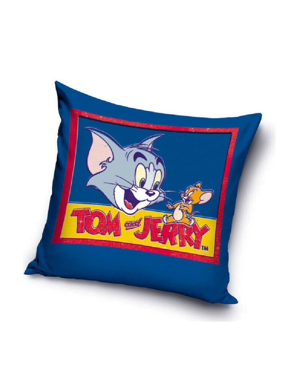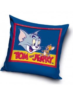 Fata de perna, Tom si Jerry, albastra, 40 x 40 cm, inchidere cu fermoar, imprimeu identic fata - verso, 100% poliester.