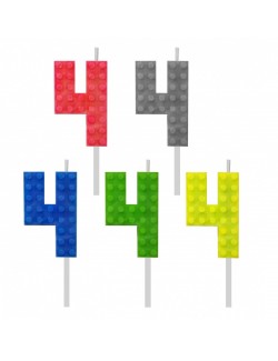 Lumanare tort, Bricks - Constructii, Cifra 4, inaltime 5,5 cm, din parafina, culori diferite: verde, galben, gri, albastru, rosu, este fixata pe un suport din plastic, perfecta pentru petreceri aniversare.