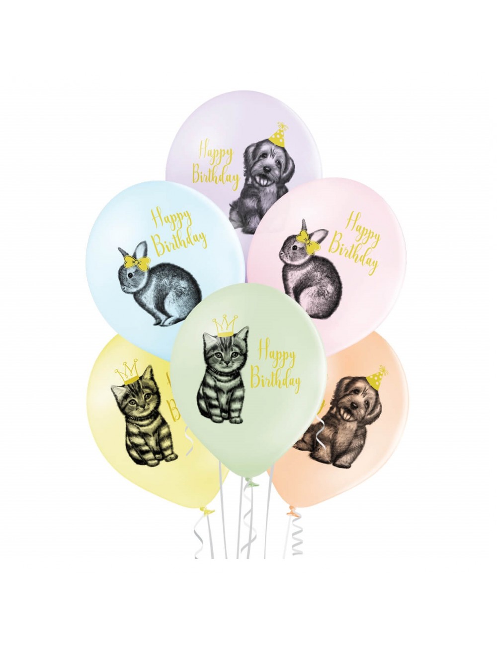 Set 6 baloane latex, Animale domestice, calitate premium, 30 cm, culori pastelate, imprimate cu pisicute, catei si iepurasi, potrivite pentru petreceri tematice.
