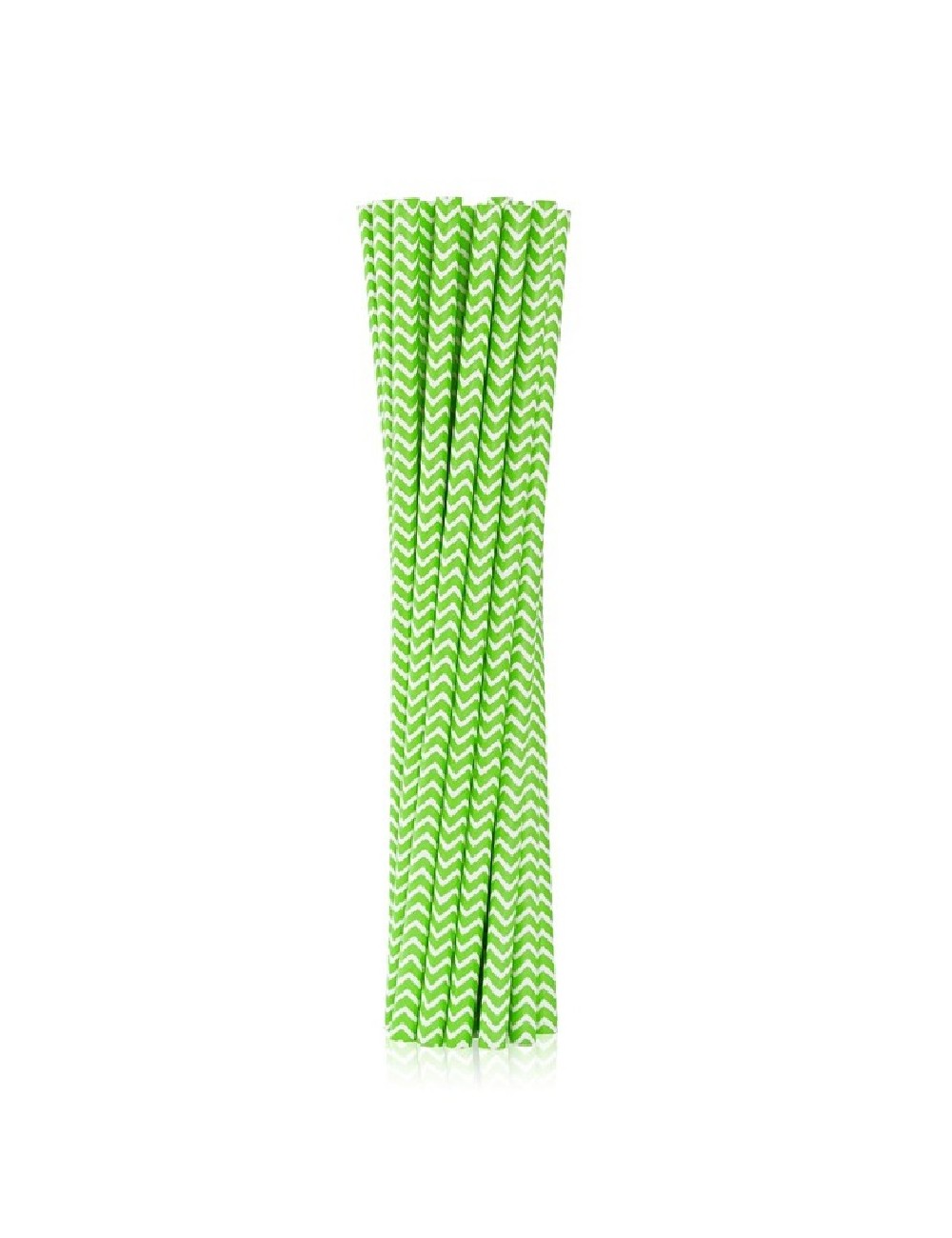 Set 12 paie bauturi, verde lime, lungime 19,7 cm, diametru 6 mm, din hartie, imprimate cu un model zig-zag alb.