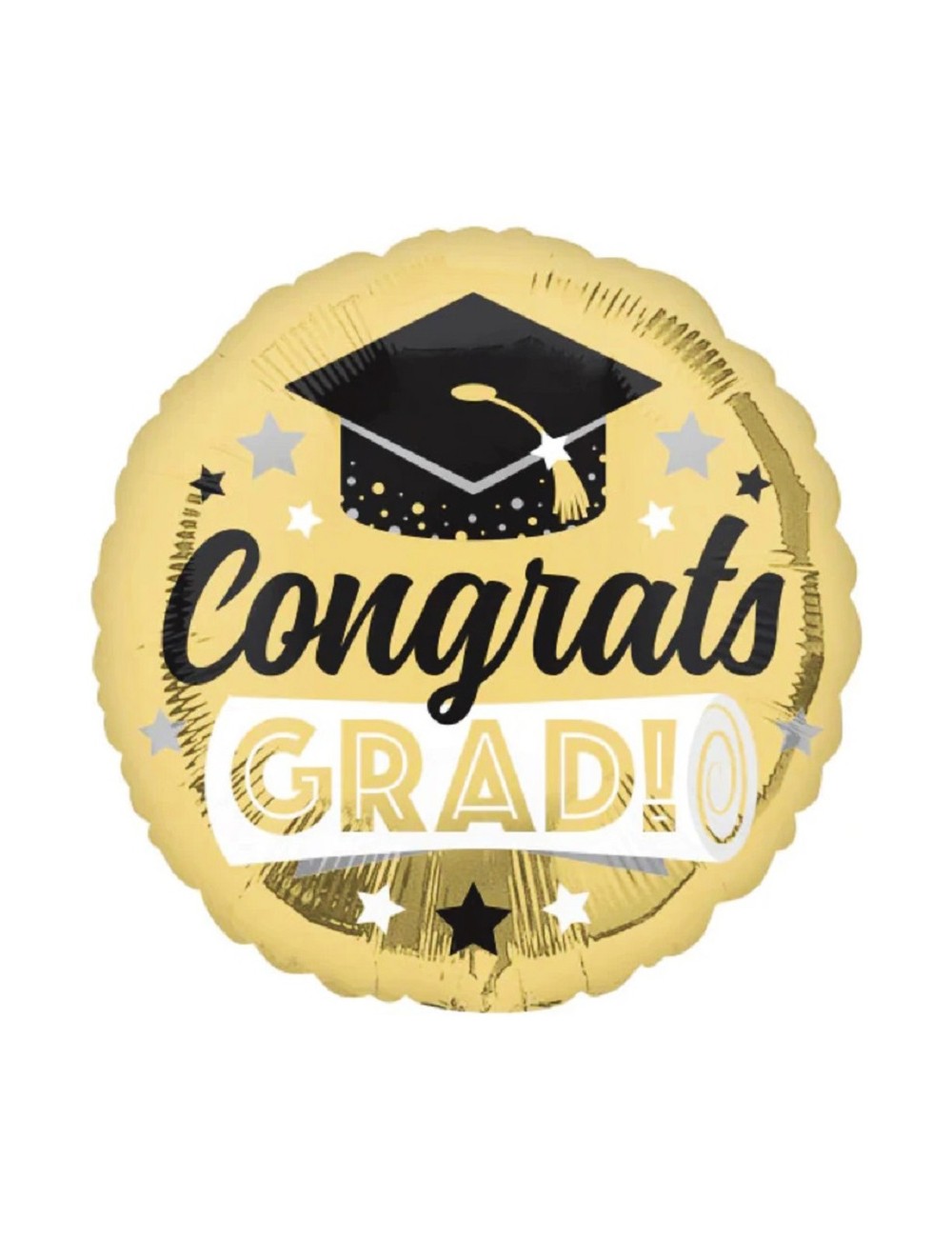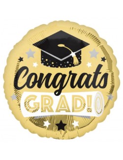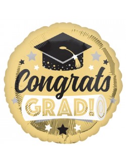 Balon folie Congrats Grad!, rotund, diametru 43 cm, auriu, imprimeu alb-negru, identic fata-verso, poate fi umflat cu aer (nu pluteste) sau cu heliu (pluteste).