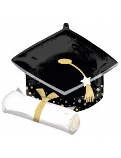 Balon folie, Toca si diploma absolvent, dimensiuni 28 x 30 cm, culori negru-alb-auriu. Necesită umflare (doar) cu aer și etanșare termică.