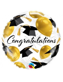 Balon folie party absolvire, Congratulations, aprox. 46 cm, imprimeu auriu-negru, identic fata-verso, poate fi umplut cu aer (nu pluteste) sau cu heliu (pluteste).