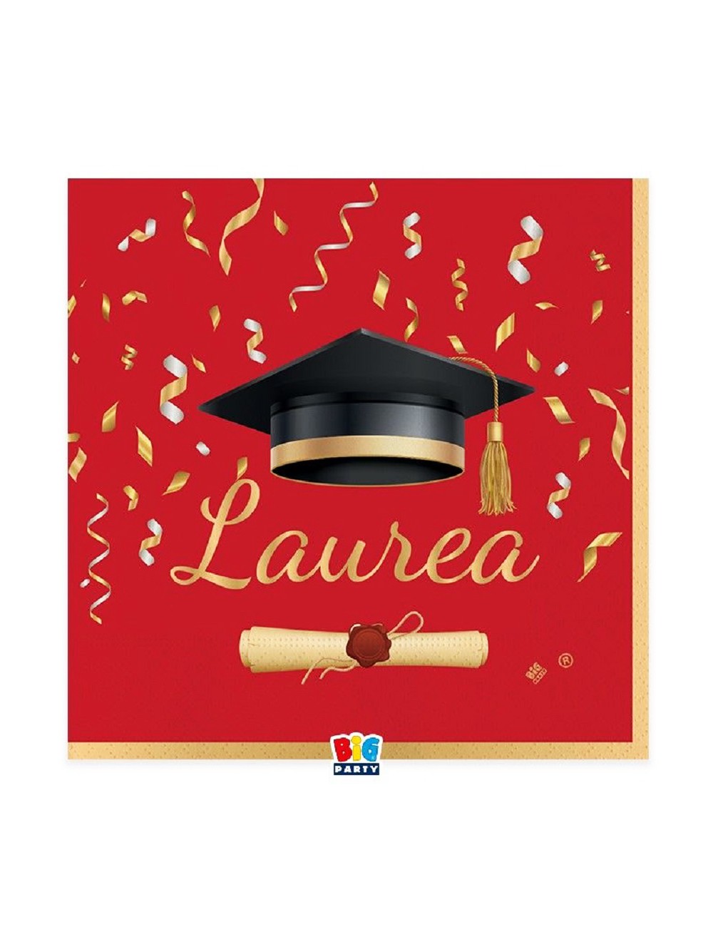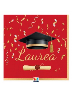 Set 20 servetele Party Absolvire - Laurea Glamour, dimensiuni 33 x 33 cm (extins), 2 straturi de hartie rosie cu imprimeu negru-auriu.