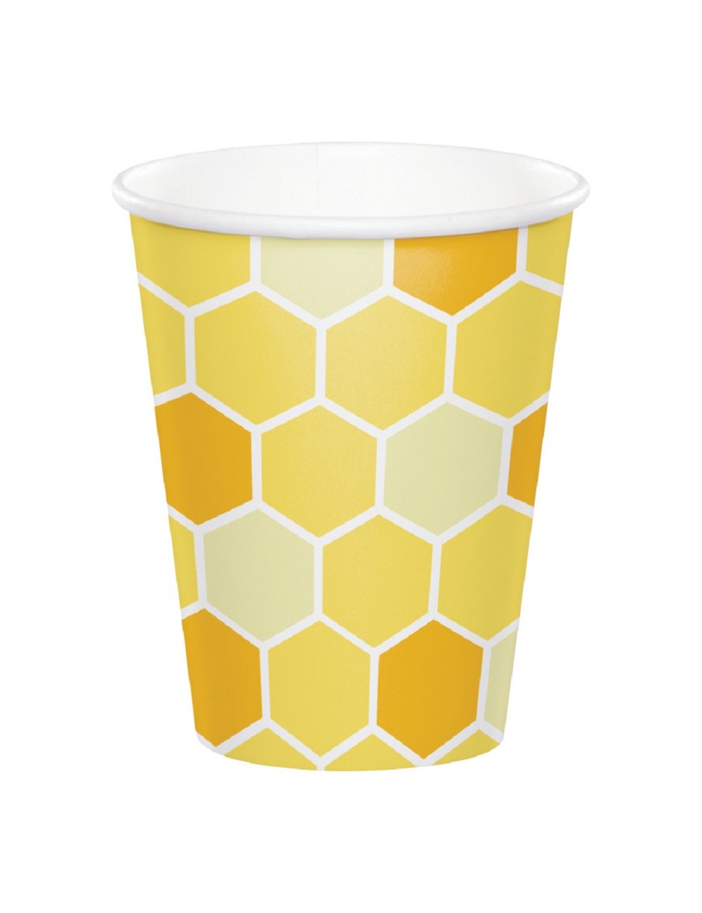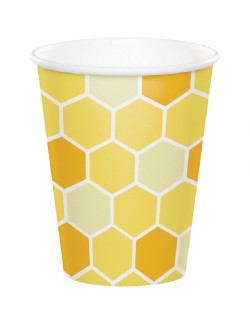 Set 8 pahare Party Albinute Bumblebee, 250 ml, de unica folosinta, din carton, imprimeu fagure de miere, nuante de galben.