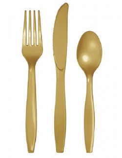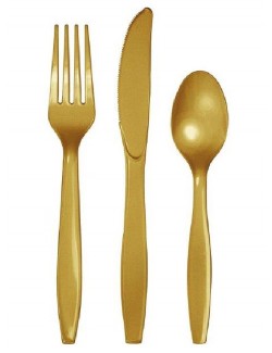 Set 18 tacamuri Aurii, Glittering Gold, din plastic rezistent, reutilizabile, contine 18 piese: 6 furculite (17 cm), 6 cutite (18 cm) si 6 lingurite (15 cm).