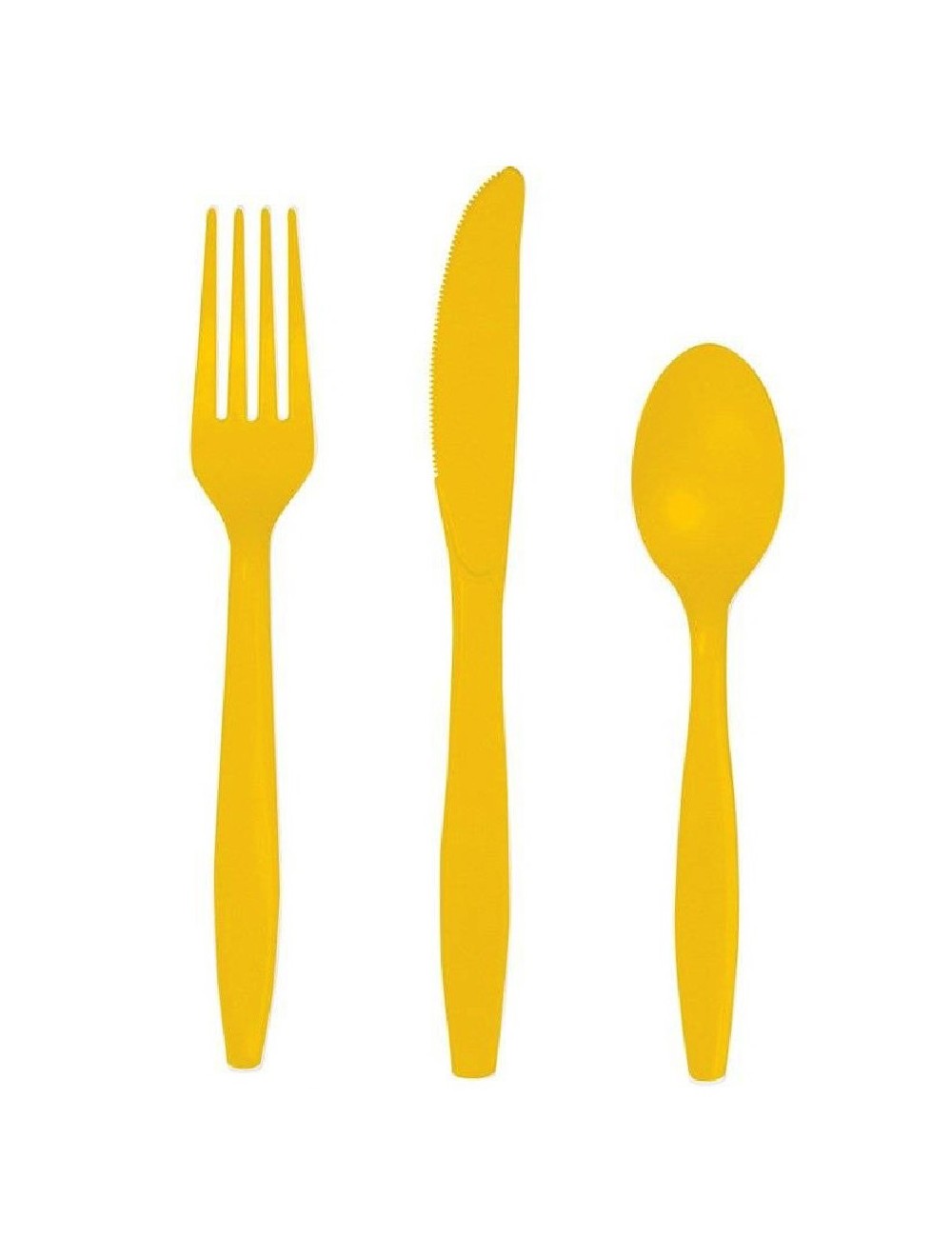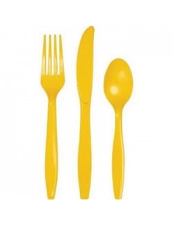Set 24 tacamuri galbene, reutilizabile, din plastic rezistent, contine: 8 furculite, 8 cutite si 8 lingurite.