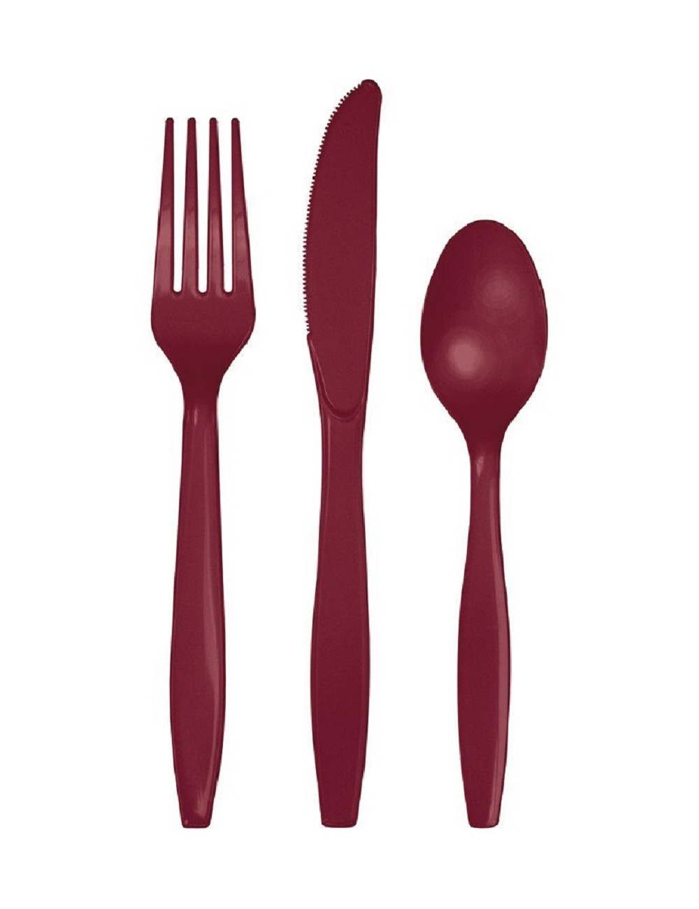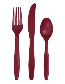 Set 24 tacamuri Burgundy, reutilizabile, din plastic rezistent, contine: 8 furculite (18 cm), 8 cutite (19 cm) si 8 lingurite (15 cm).