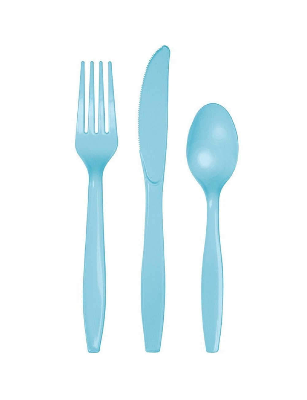 Set 24 tacamuri bleu, Pastel Blue, reutilizabile, din plastic rezistent, contine: 8 furculite (18 cm), 8 cutite (19 cm) si 8 lingurite (15 cm).