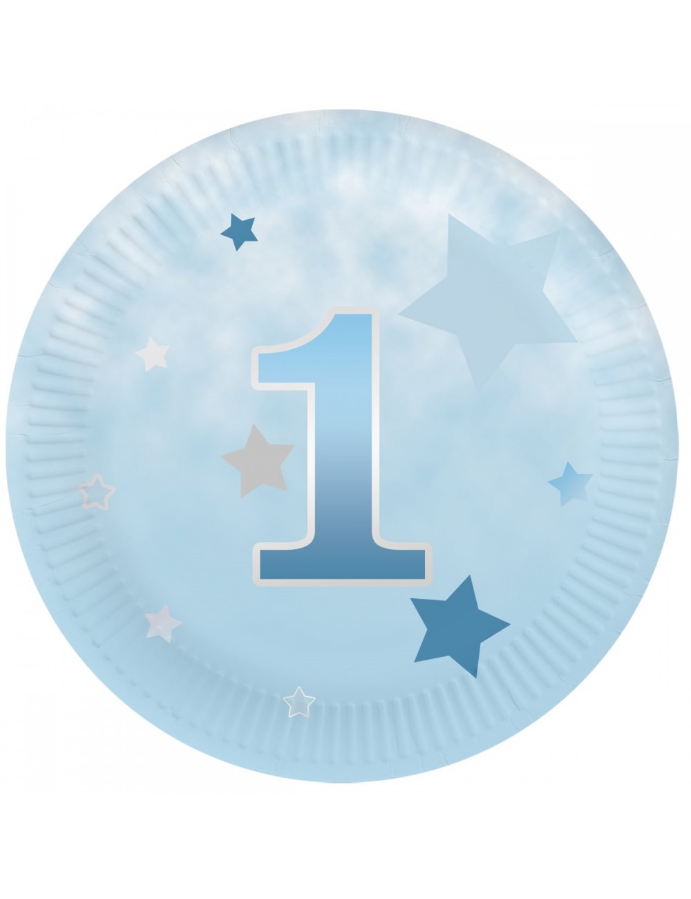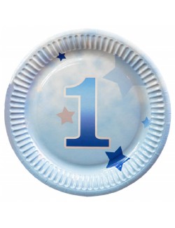 Set 6 farfurii desert, Prima Aniversare - Cifra 1, bleu, diametru 18 cm, de unica folosinta, fabricate din carton, nu contin plastic.