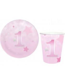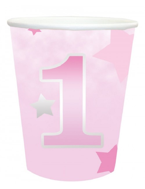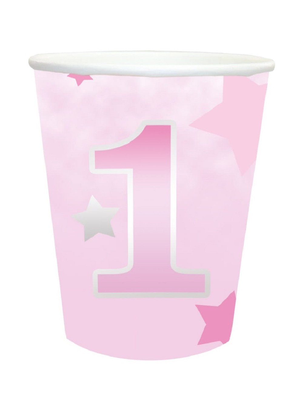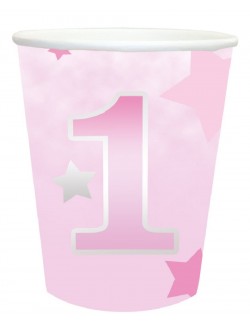 Set 6 pahare, Prima Aniversare Cifra 1, capacitate 250 ml, de unica folosinta, din carton, imprimeu cu cifra 1 si stelute.