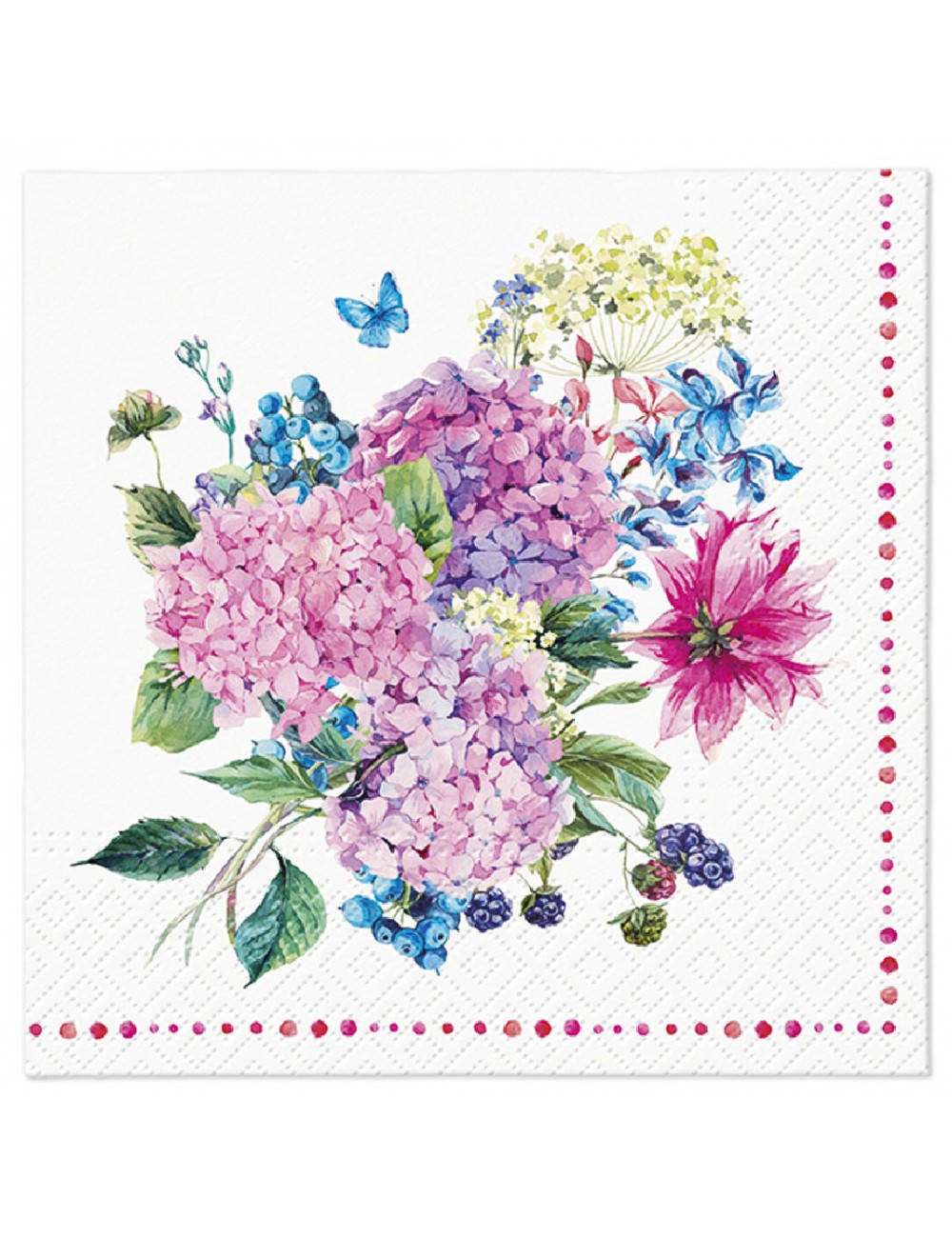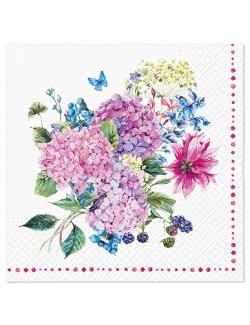 Set 20 servetele Buchet de Hortensii, dimensiuni 33 x 33 cm (extins), din 3 straturi de hartie, fond alb, imprimeu multicolor.
