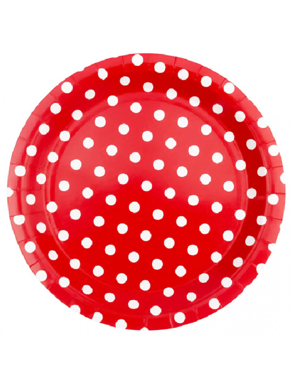 Set 6 farfurii rosii cu buline albe, diametru 23 cm, de unica folosinta, fabricate din carton, nu contin plastic.