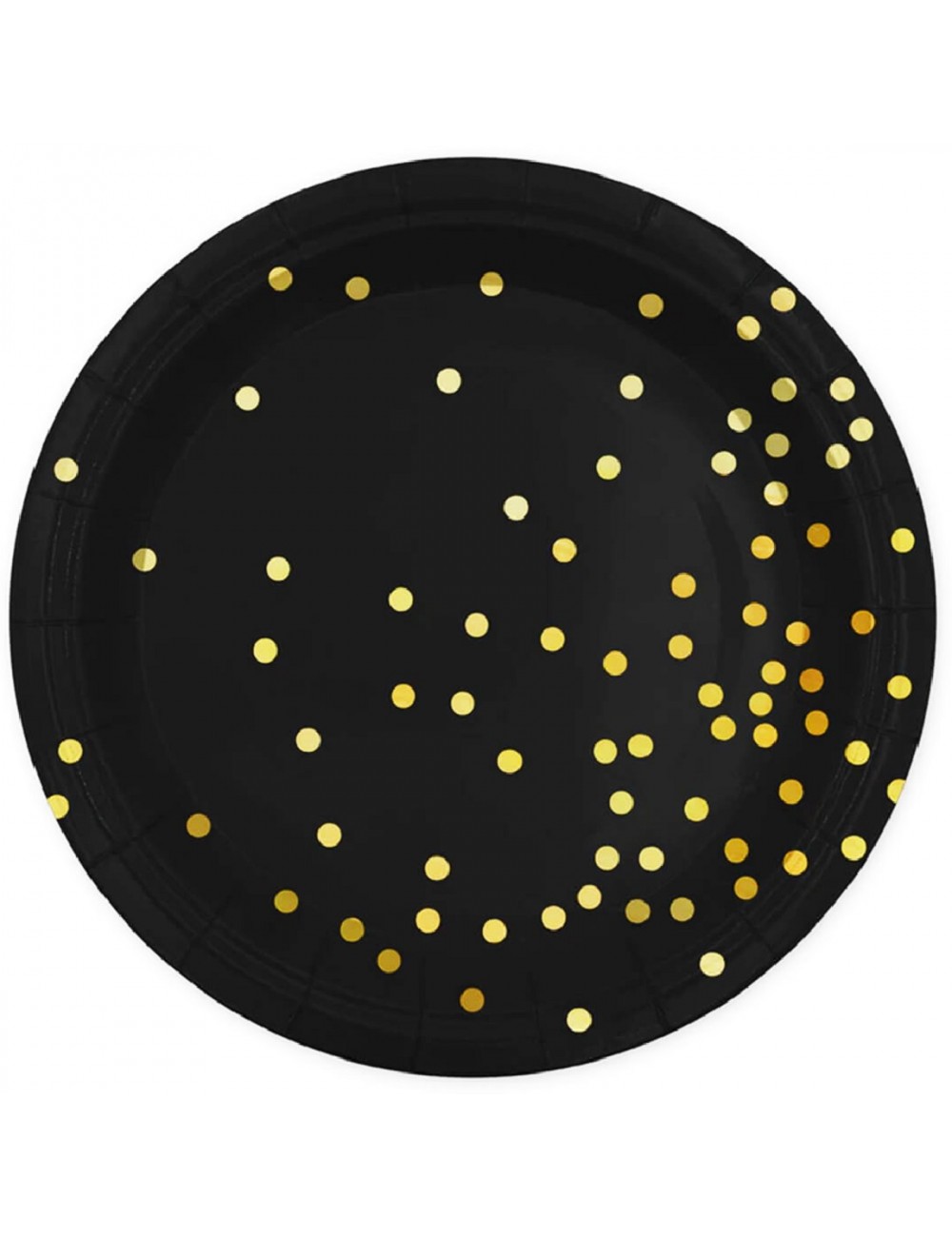 Set 6 farfurii negre cu buline aurii, diametru 23 cm, de unica folosinta, fabricate din carton, nu contin plastic.