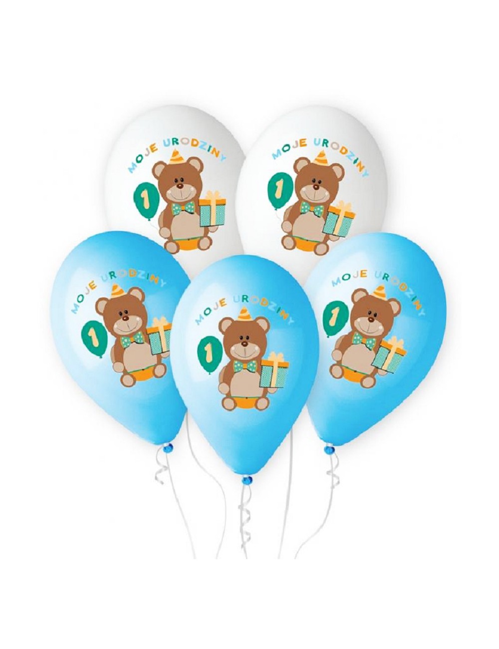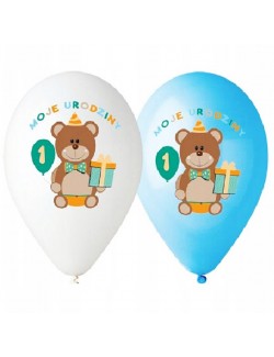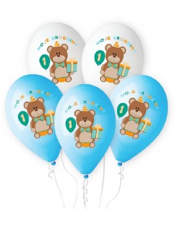 Set 5 baloane Ursulet Prima aniversare baiat, culori bleu-alb, fabricate din cauciuc natural biodegradabil - latex, calitate premium.
