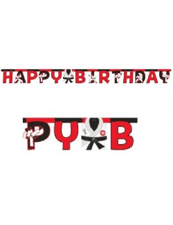 Ghirlanda Karate Happy Birthday, lungime 300 cm, din carton, culori rosu-alb-negru, dimensiuni litera aprox. 17 x 17 cm.