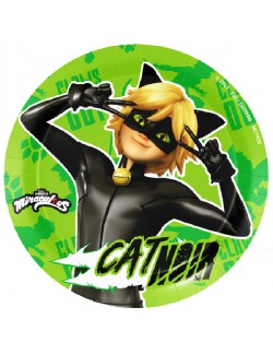 Set 8 farfurii desert Motan Noir, diametru 18 cm, de unica folosinta, din carton, potrivite pentru petreceri tematice Disney Miraculous Ladybug & Motan Noir.