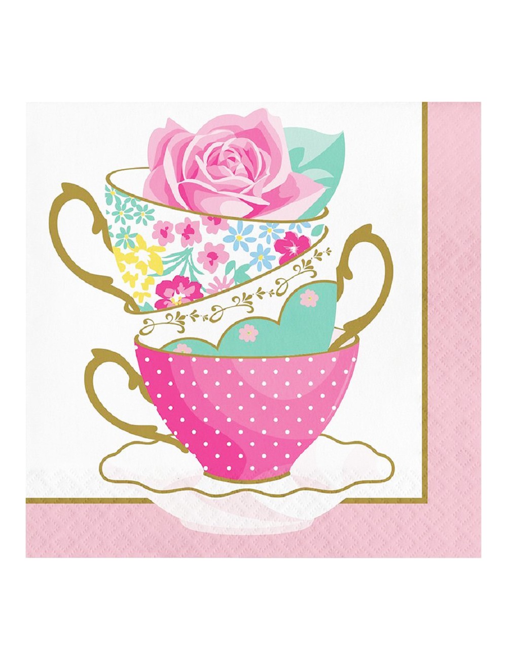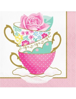 Set 16 servetele Floral Party - Tea Cups, dimensiuni 33 x 33 cm (extins), din 2 straturi de hartie fina, imprimeu identic pe cele 2 parti.