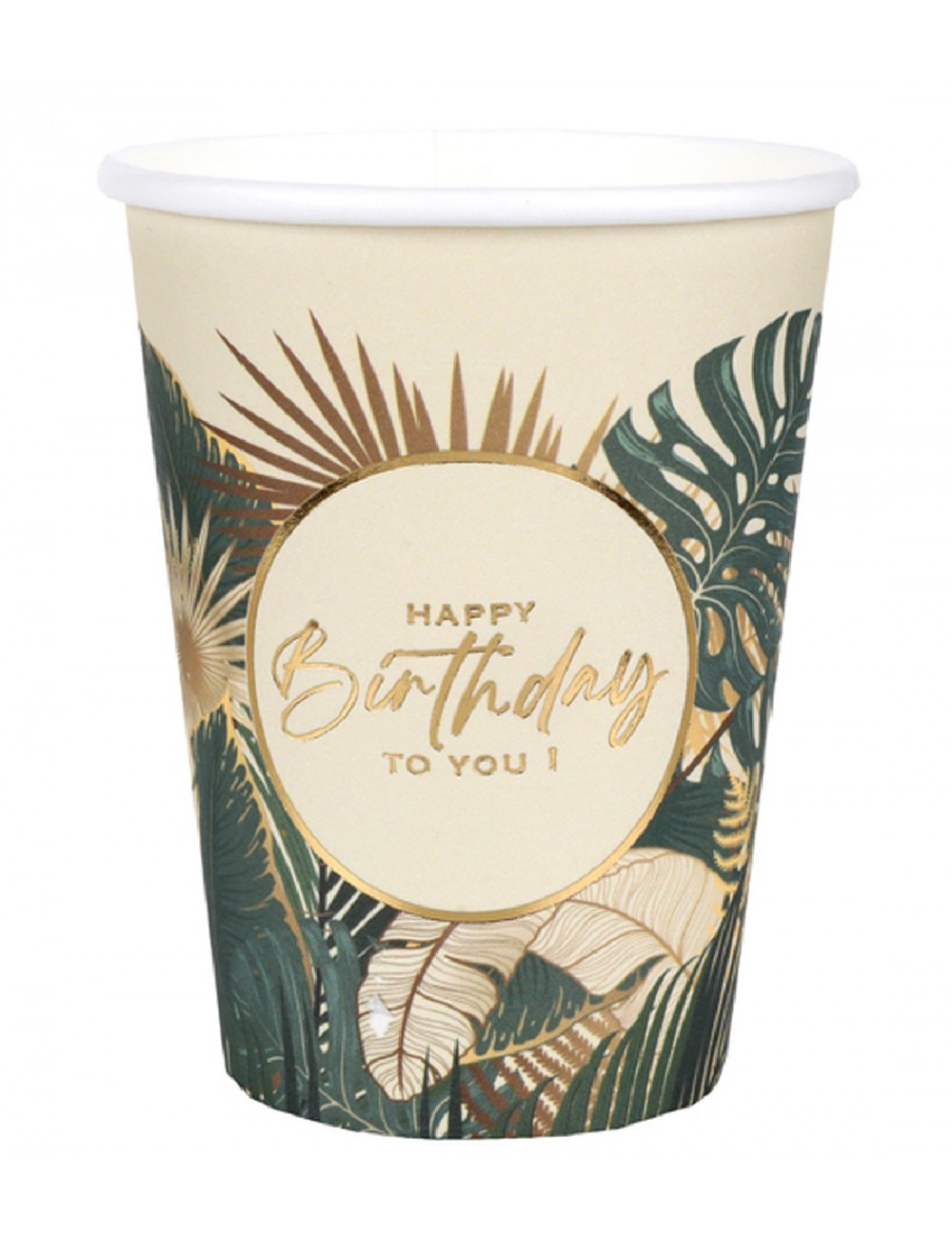 Set 10 pahare Happy Birthday Tropical Chic, 270 ml, inaltime 9,7 cm, de unica folosinta, din carton, imprimeu frunze tropicale verzi-aurii și o inscripție aurie La mulți ani!.