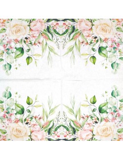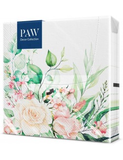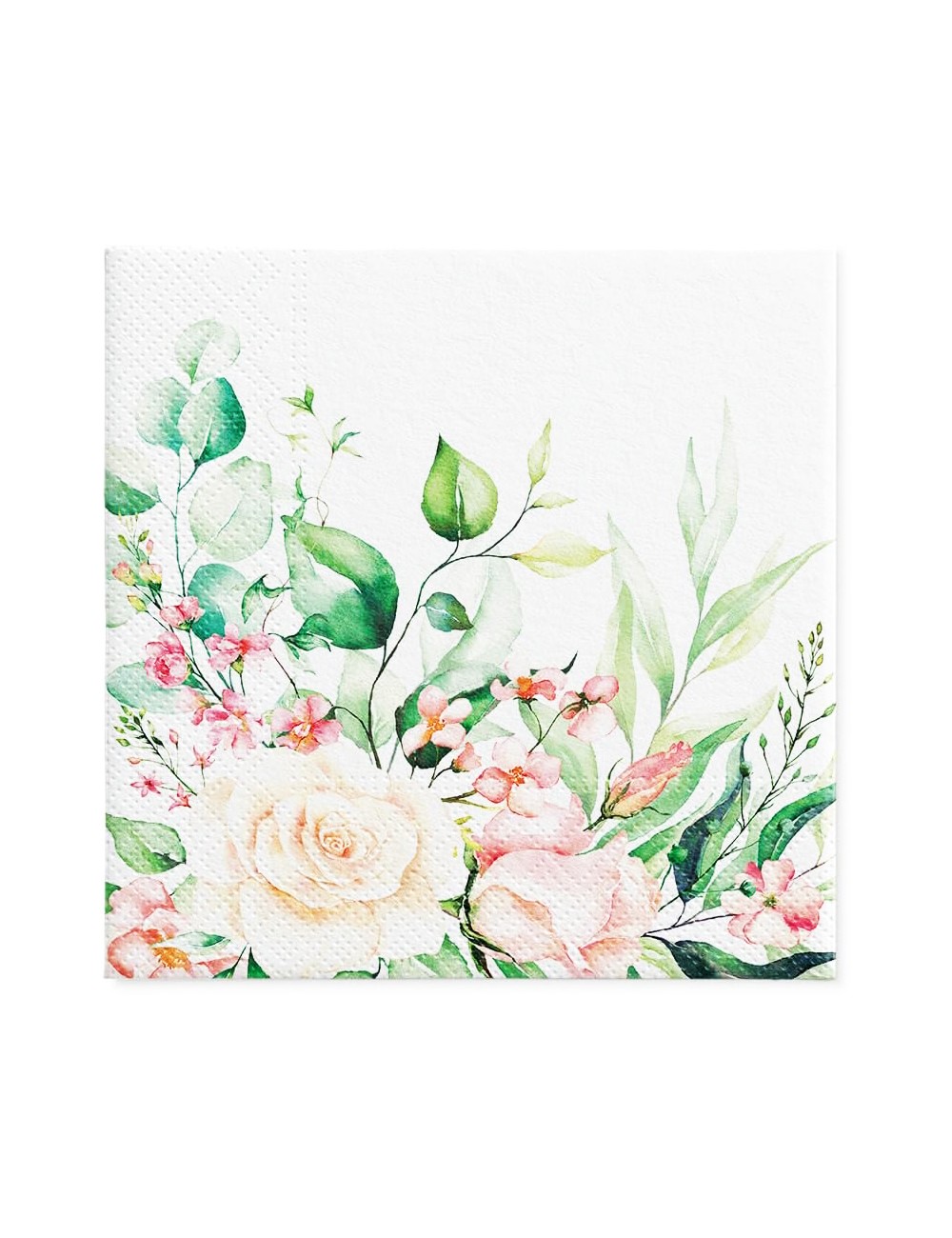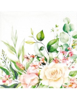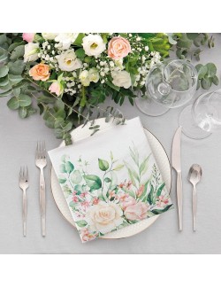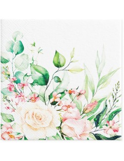 Set 20 servetele Floral Moment, dimensiuni 33 x 33 cm (extins), din 3 straturi de hartie fina, culori pastelate, imprimeu identic pe toate laturile.