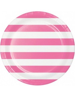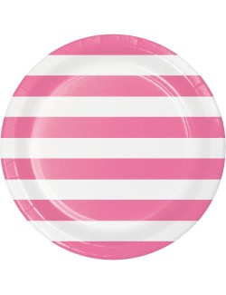 Set 8 farfurii dungi alb-roz, diametru 22 cm, de unica folosinta, fabricate din carton, nu contin plastic.