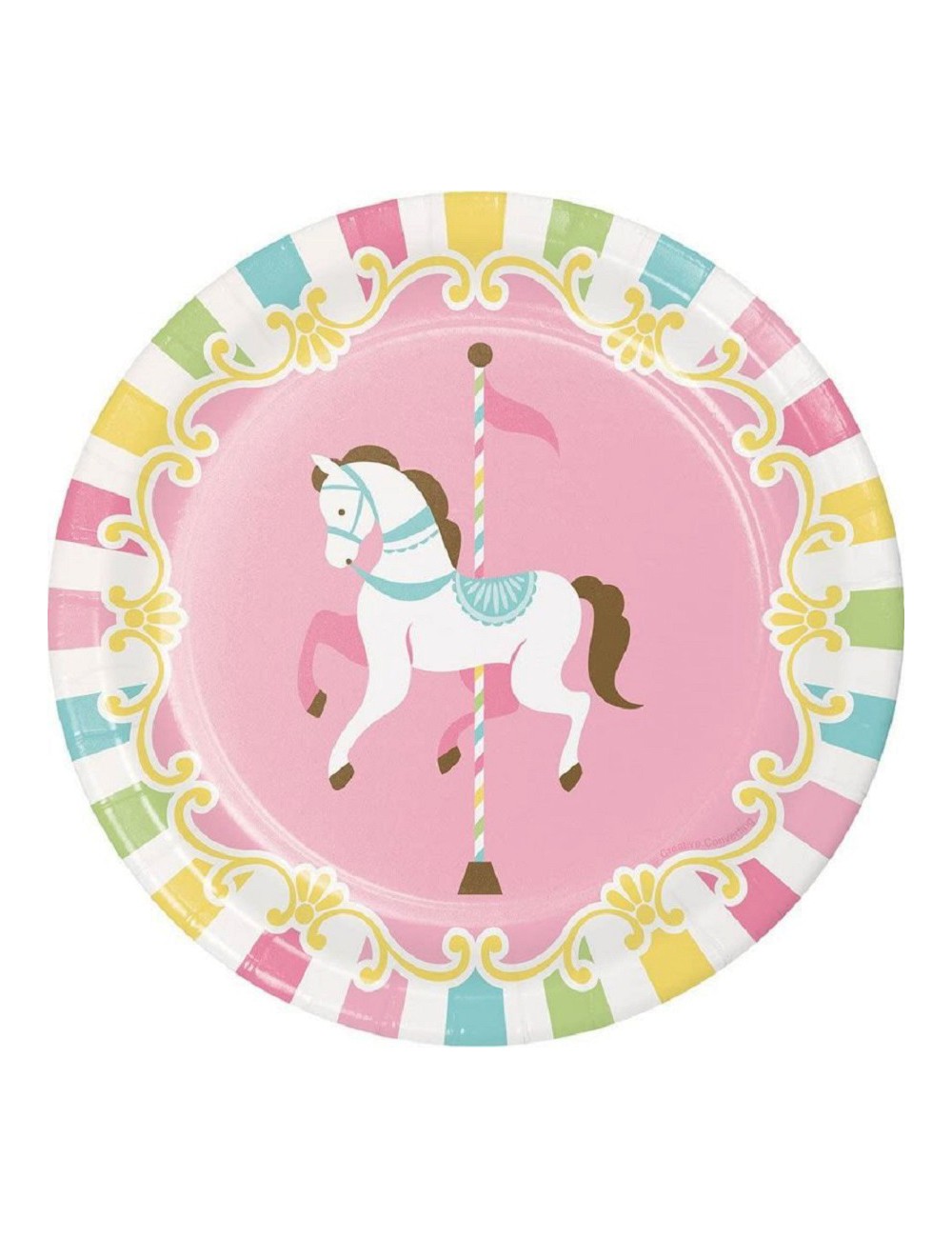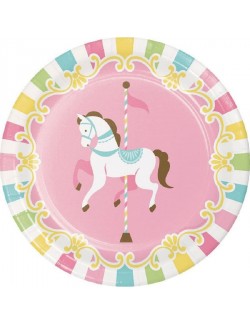 Set 8 farfurii Calut Carusel, diametru 18 cm. de unica folosinta, fabricate din carton, perfecte pentru petreceri de copii.
