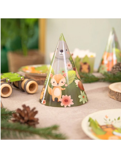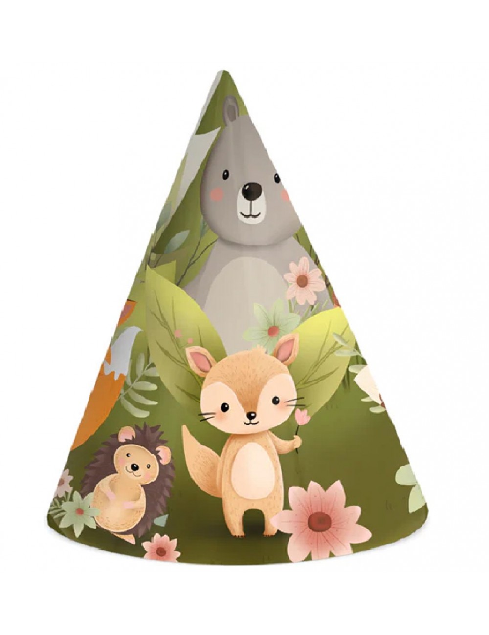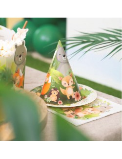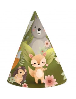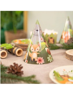 Set 6 coifuri Party in padure, din carton, prindere cu elastic, inaltime 16 cm, diametru 10 cm.