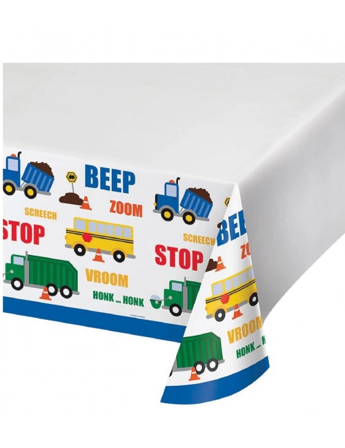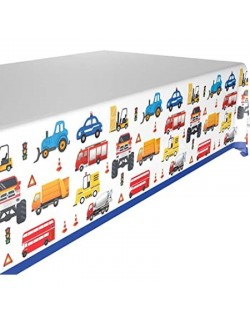 Fata de masa Trafic - Vehicule multicolore, dimensiuni 121 x 223 cm, fond alb cu imprimeu cu diferite vehicule colorate, precum și cu semne de construcție, conuri de trafic si onomatopee.