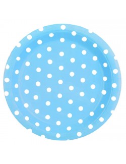 Set 6 farfurii bleu cu buline albe, diametru 18 cm, de unica folosinta, fabricate din carton, nu contin plastic.