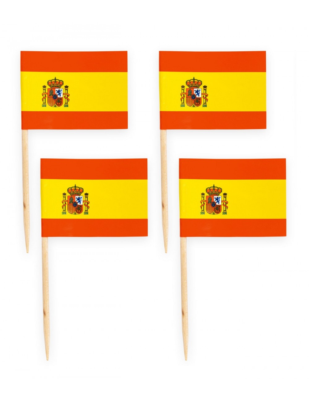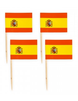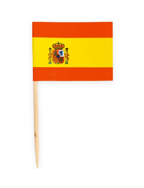 Set 50 Scobitori decorative, Steag Spania, inaltime aprox. 6,5 cm, latime 3,5 cm, suport din lemn si steag din hartie imprimata.