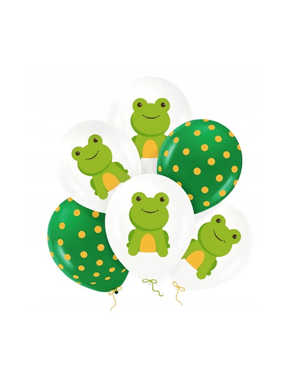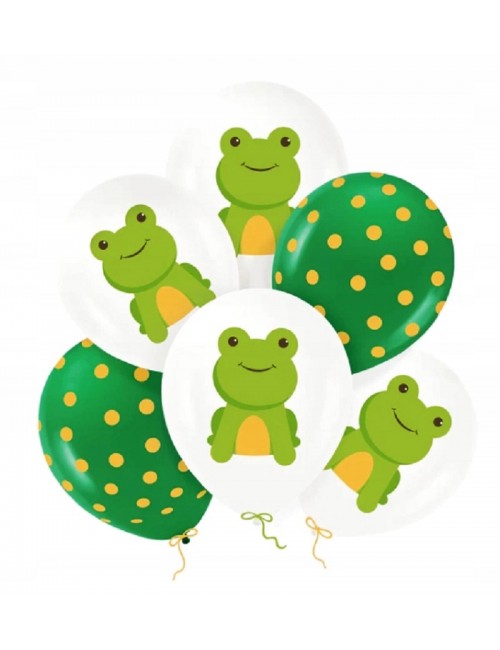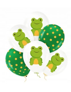 Set 6 baloane Broscuta, 30 cm, culori alb-verde, din latex natural biodegradabil, pot fi umplute cu aer sau cu heliu.