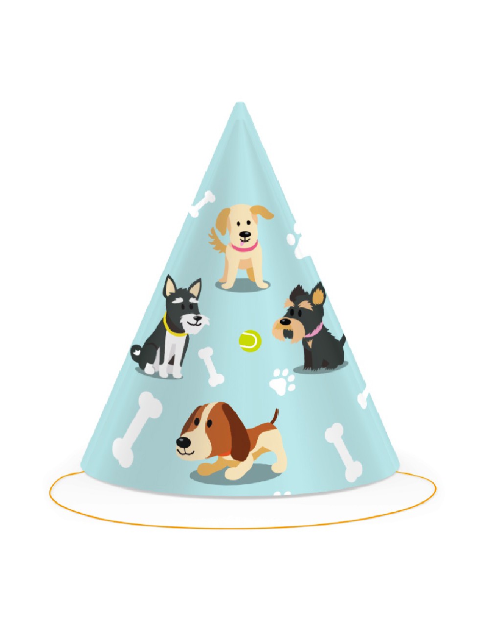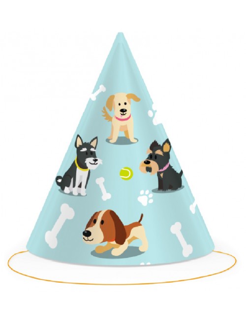 Set 6 Coifuri cu Catei - Dog party, din carton, prindere cu snur elastic, dimensiuni 11 x 16 cm, imprimeu multicolor.