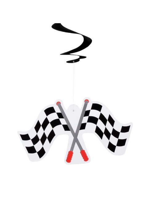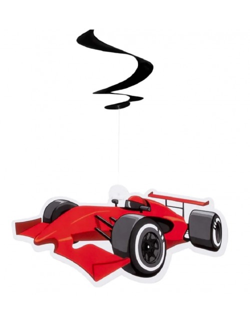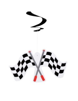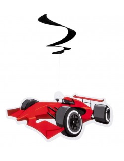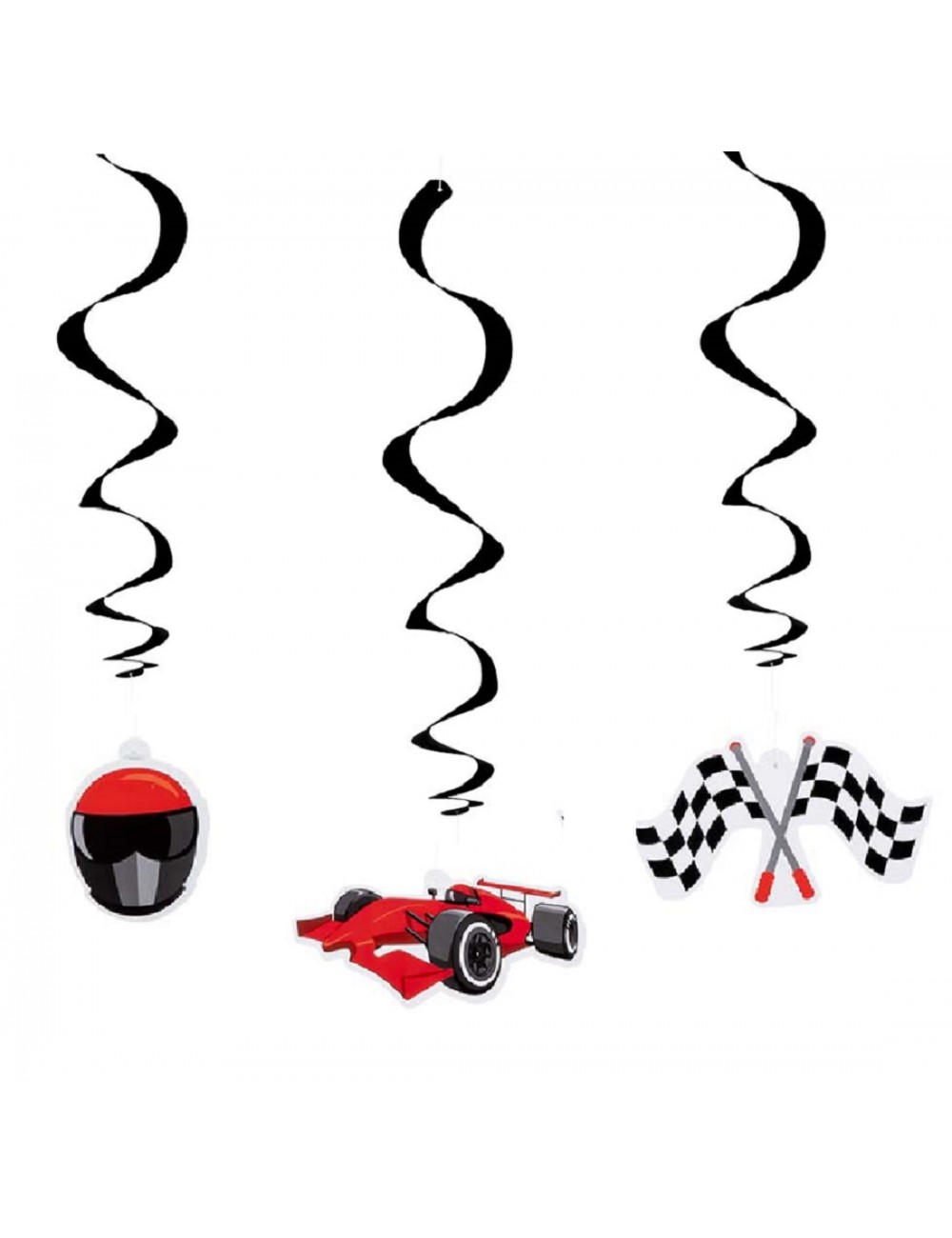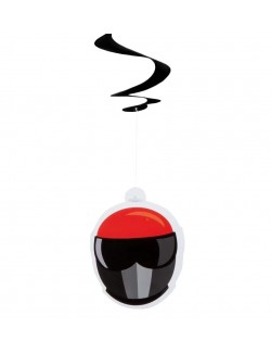 Set 3 decoratiuni suspendate Cars Racing, cu spirale din plastic negru de care sunt atasate 3 medalioane din hartie cu imaginea unei masini de curse, o casca de pilot si steagurile care anunta incheierea cursei.