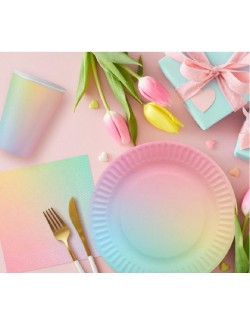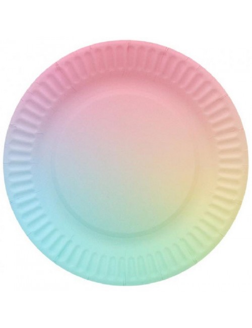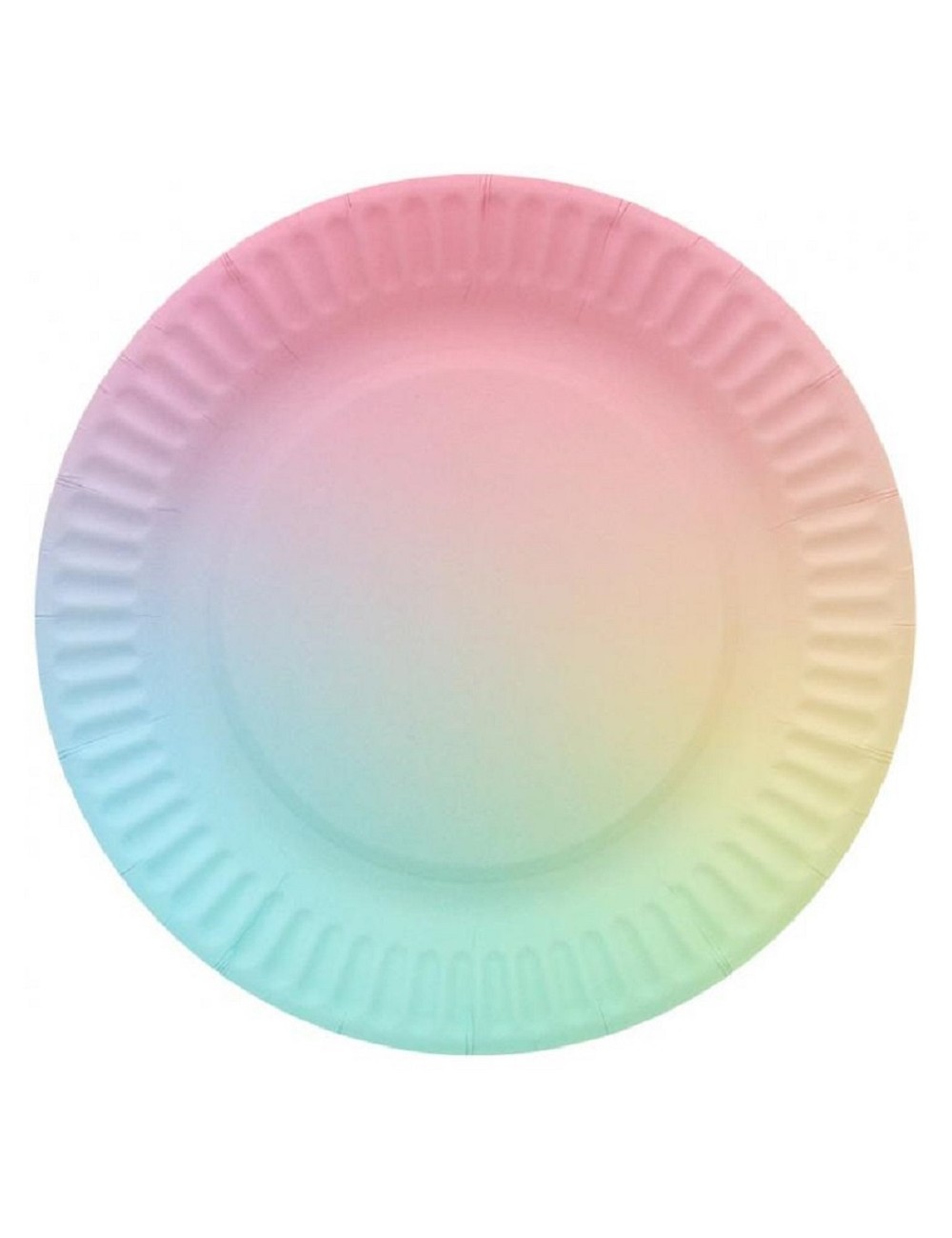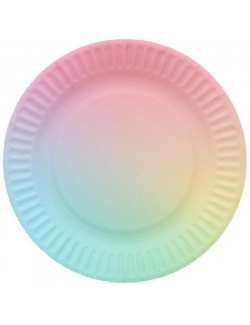 Set 6 farfurii desert, Umbre multicolore, diametru 18 cm, de unica folosinta, fabricate din carton, nu contin plastic.