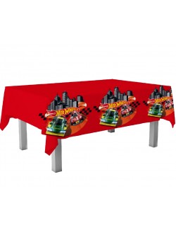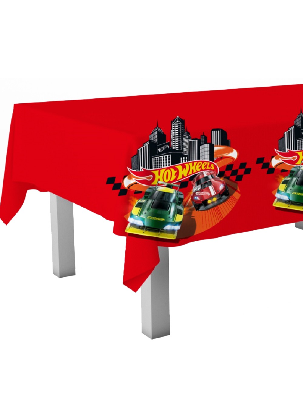 Fata de masa Hot Wheels, din plastic, dimensiuni 180 x 120 cm, culoare rosie cu imprimeu multicolor, pentru petreceri tematice.