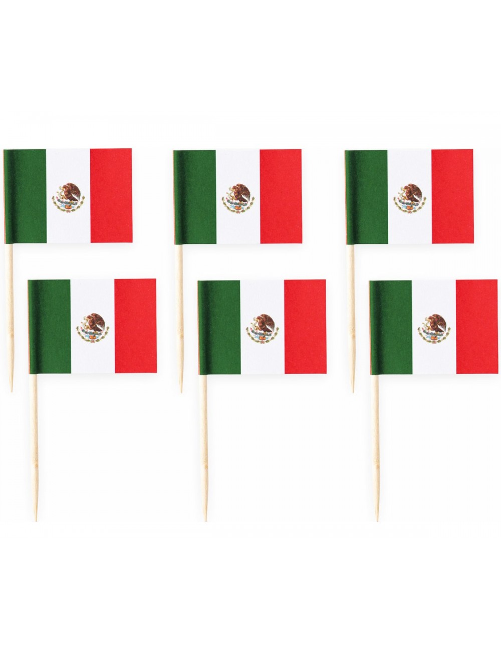 Set 50 Scobitori decorative, Steag Mexic, inaltime aprox. 6,5 cm, latime 3,5 cm, suport din lemn si steag din hartie imprimata.
