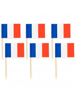 Set 50 Scobitori decorative, Steag Franta, inaltime aprox. 6,5 cm, latime 3,5 cm, suport din lemn si steag din hartie imprimata.