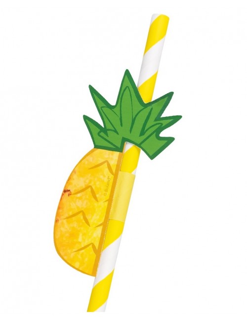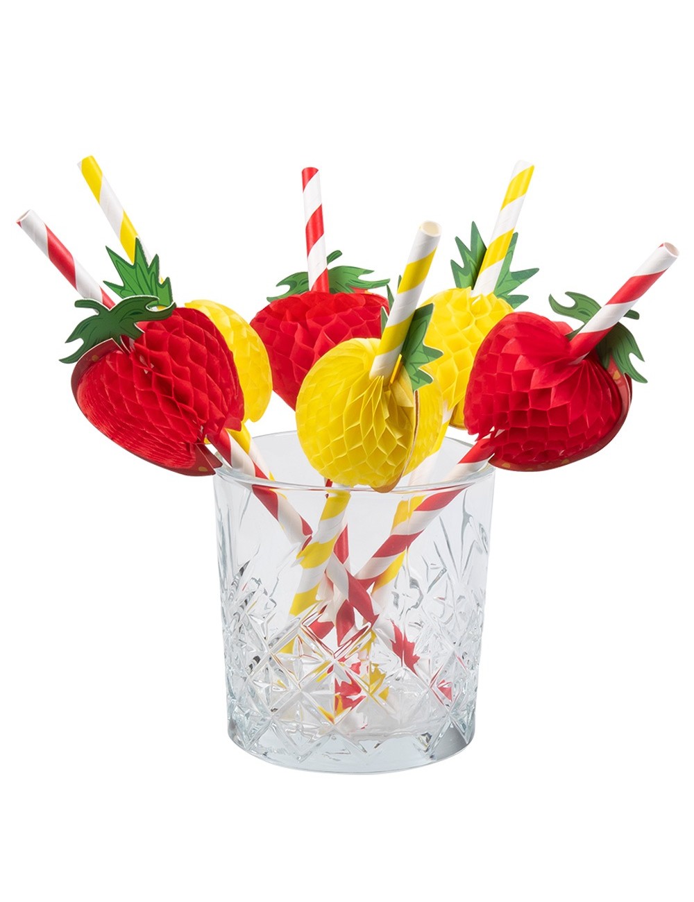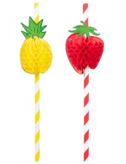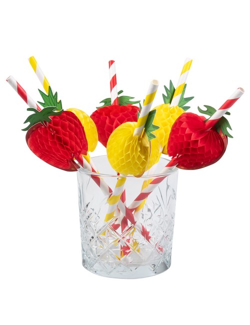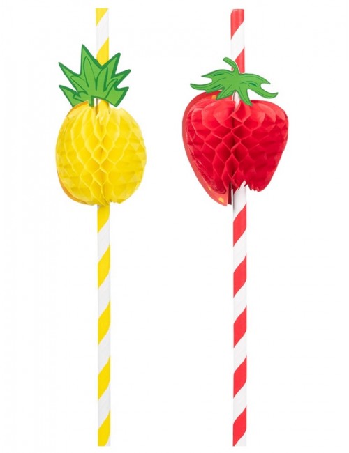 Set 6 paie hartie, Fruits party, lungime aprox. 20 cm, culori rosu-alb si galben-alb, cu decoratiuni capsune si ananas.