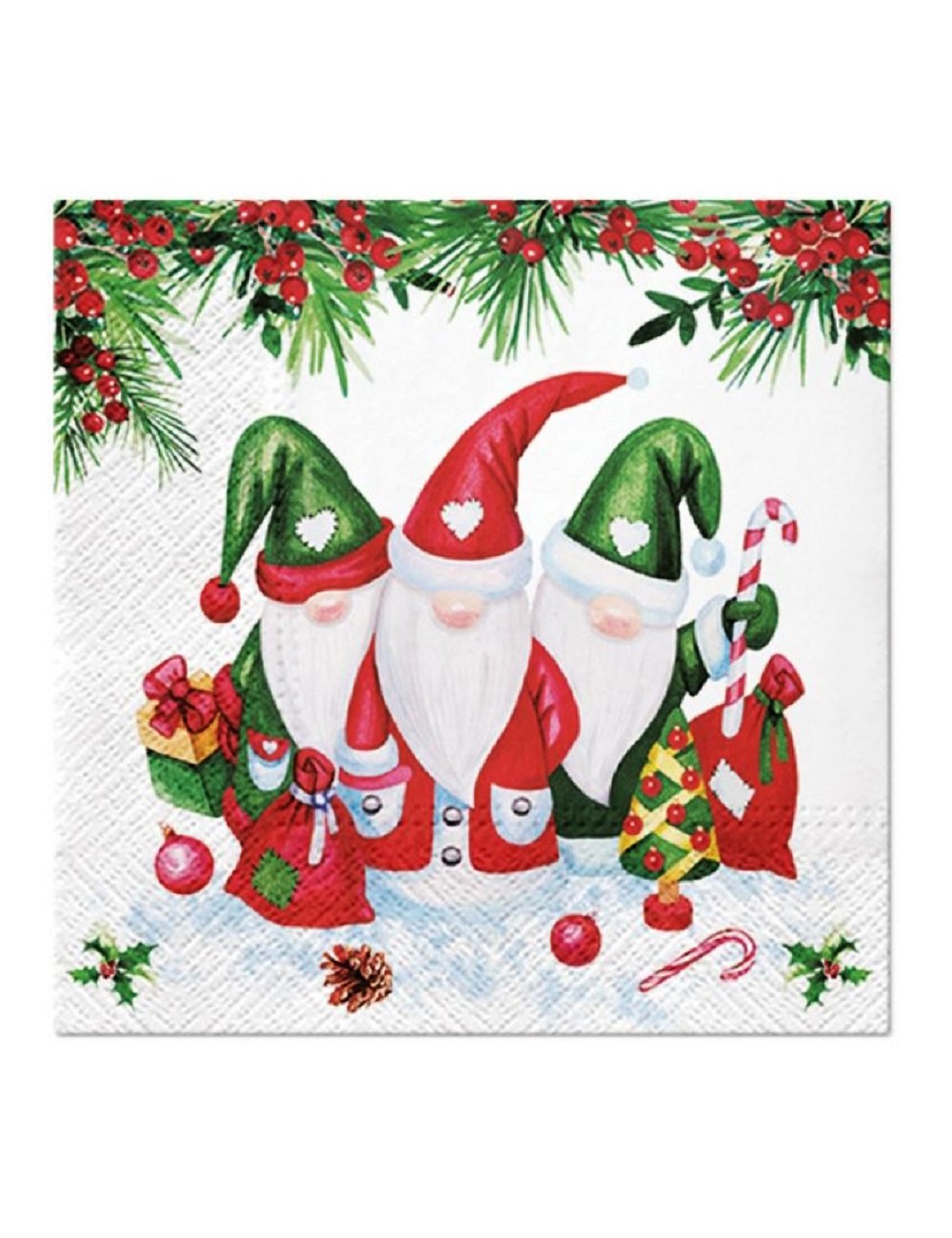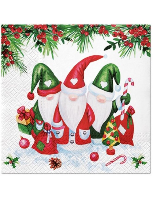 Set 20 servetele Elfi cu daruri, dimensiuni 33 x 33 cm (extins), din 3 straturi de hartie, imprimeu multicolor.